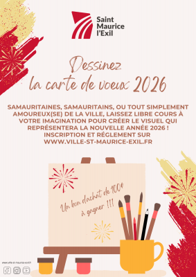 La ville de saint-Maurice l'Exil a décidé de renouveller son concours "Dessinez la carte de voeux !" Samauritaines, samauritains, ou tout simplement amoureux(se) de la ville, laissez libre cours à votre imagination pour créer le visuel qui représentera la nouvelle année 2026 !